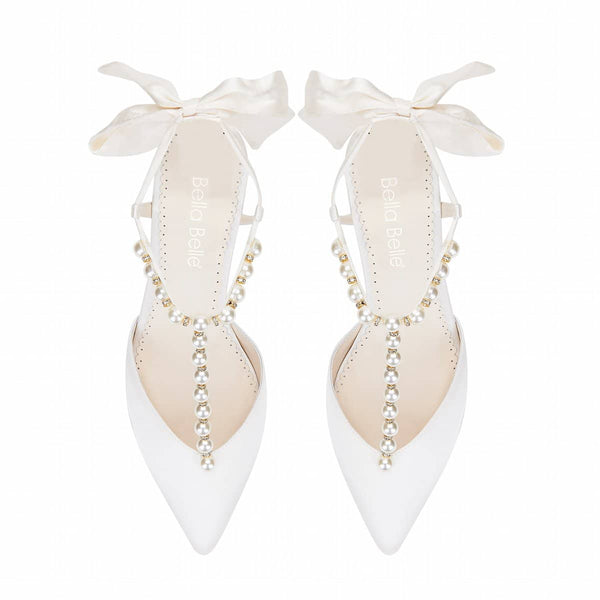 - Zapatos de tacón bajo con lazo de perlas y cristales – Diseño artesanal en color marfil con exquisitas perlas y adornos de cristal, y un elegante detalle de lazo. Garantizan un lujo atemporal y una sofisticada artesanía nupcial.
